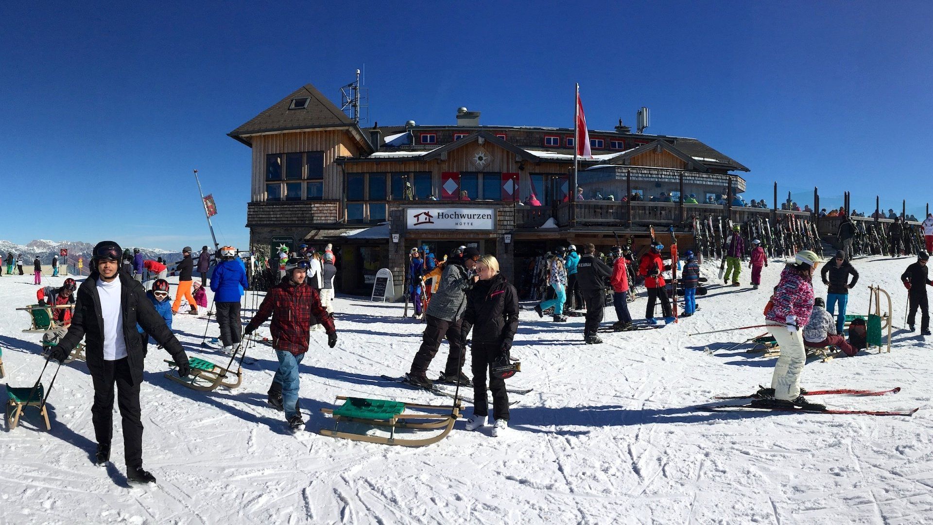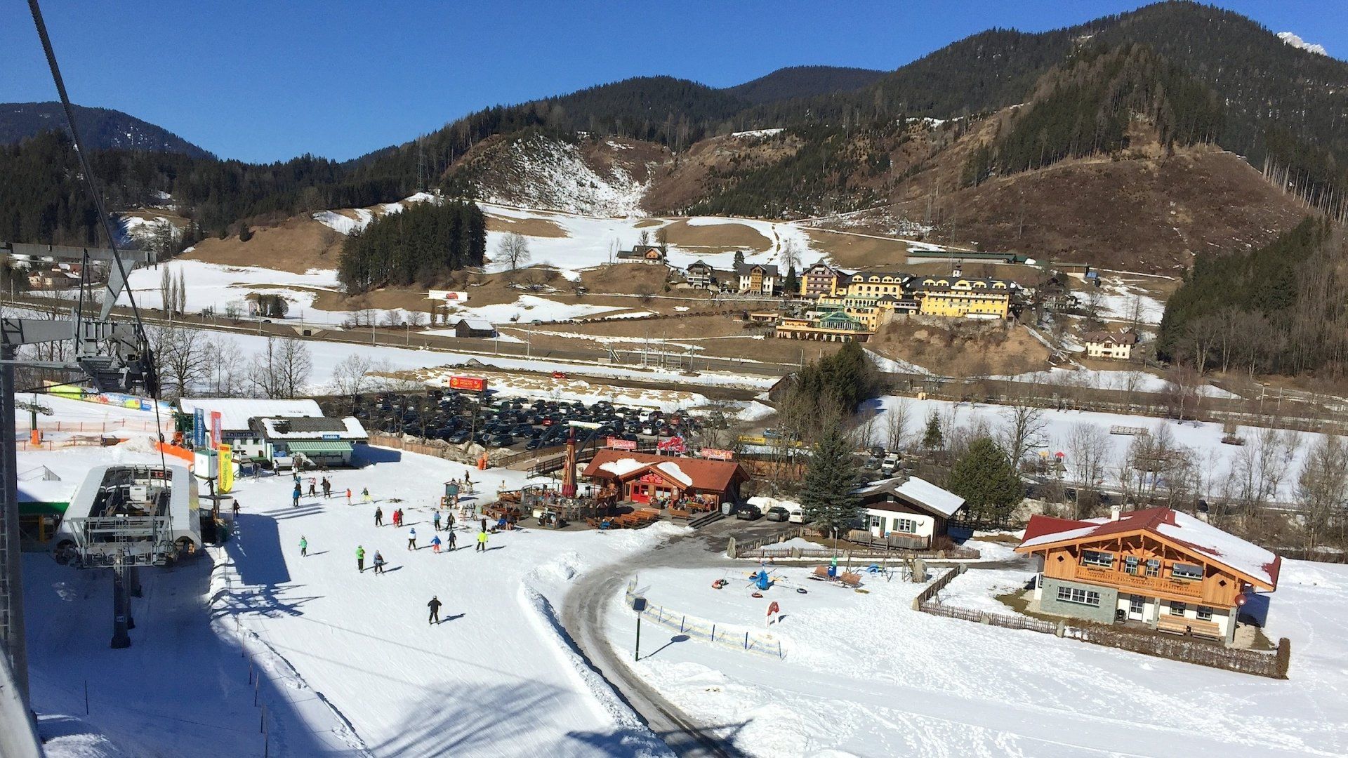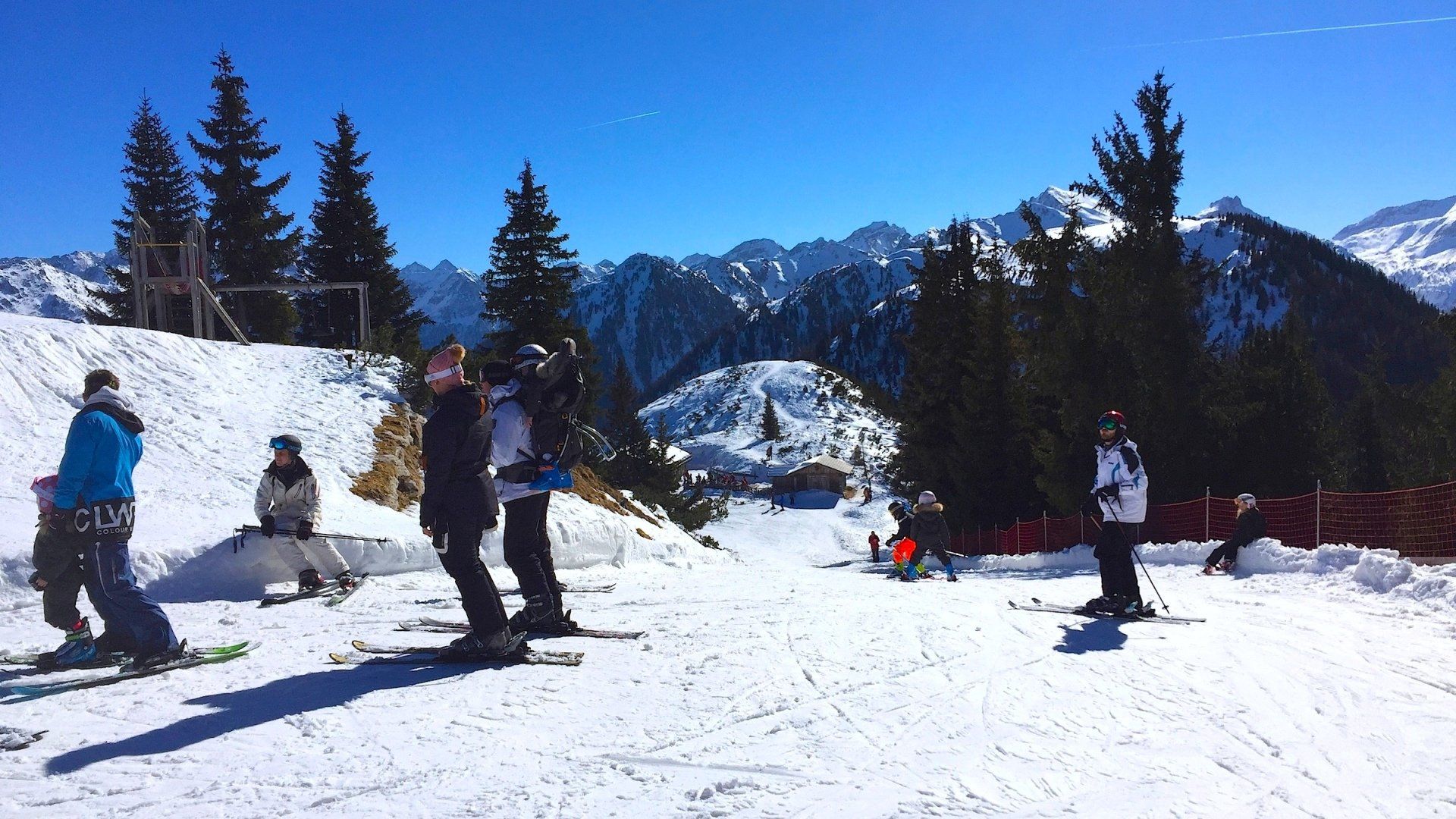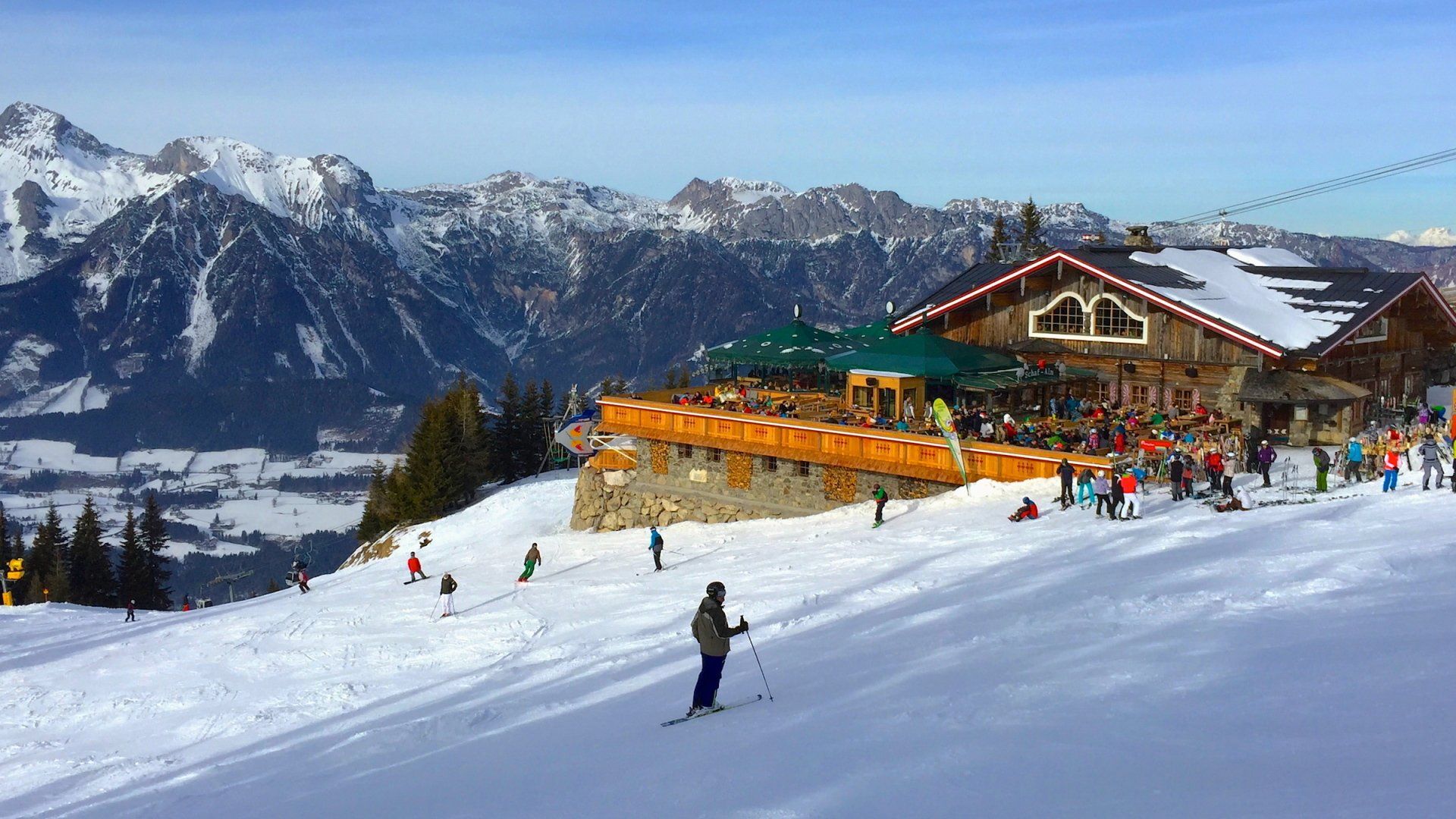 Viele Skihütten, Après-Ski an den Talstationen.